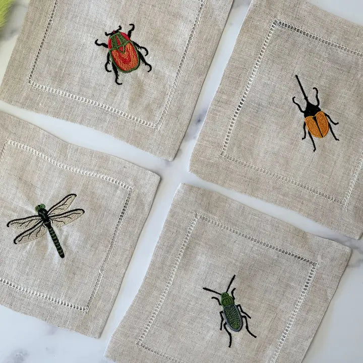 Insect Embroidered Cocktail Napkins, Set of Four