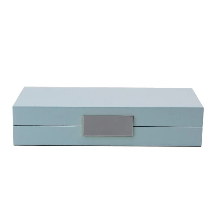 This beautiful lacquered Pale Blue Jewelry Box measures 4x9 inches and features a silver clasp and matching hinges. All of our boxes have had 20 coats of lustrous polished lacquer.