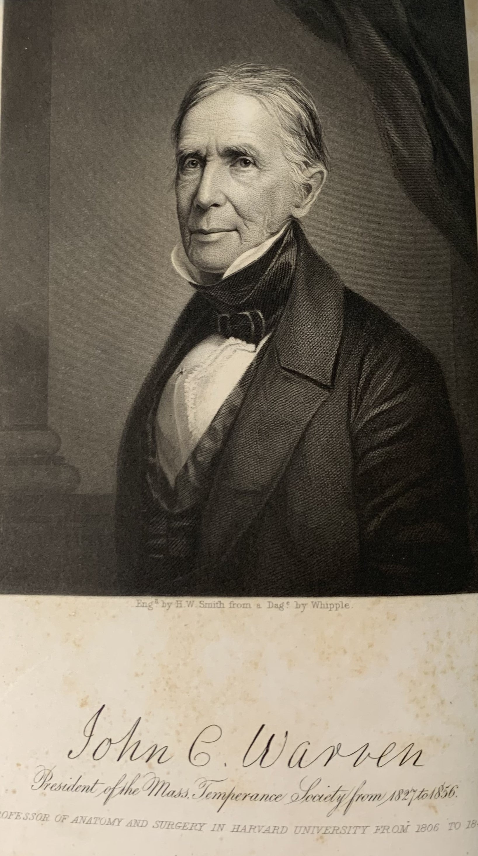 John Collins Warren (1788-1856) was president of the Massachusetts Temperance Society from 1827 to his death in1856. The son of Dr. John Warren an American Revolutionary Surgeon who would found Harvard Medical School. Warren was the first Dean of Harvard University Medical School, a founding member of Massachusetts General Hospital and founder the New England Journal of Medicine.